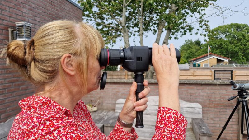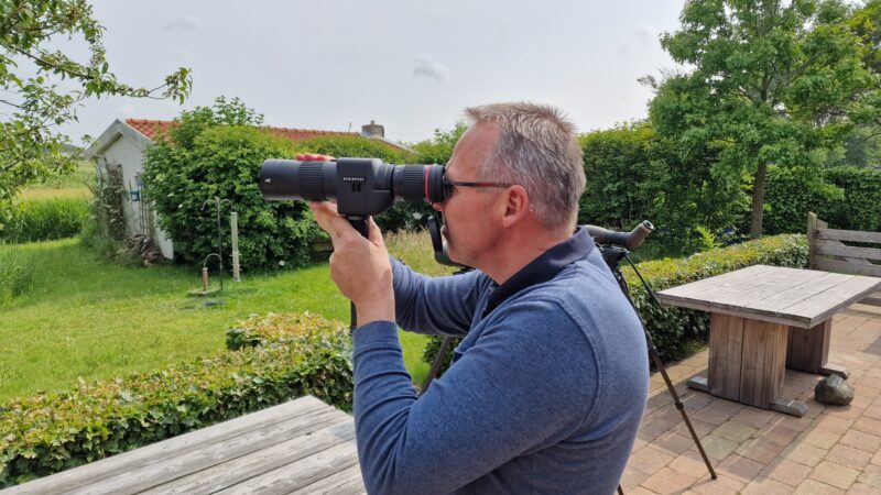 De bediening van het focussen laat wel iets te wensen over met de scherpstelring zover naar voren (het is op zijn minst wennen). Dit wordt beter als je het kleine statiefpootje gebruikt wat wordt meegeleverd. Hierdoor hou je het statief met een hand vast en met de andere hand hou je de telescoop bij het scherpstelwiel vast. Dit geeft een natuurlijker bediening. Het totaalgewicht met statiefje is 1535 gram. Dat is wel een dingetje. Langdurig kijken geeft al snel een vermoeide arm. Daarnaast moet je hem dan ook met een riem om de nek of schouder hangen. Dat gaat samen met al je andere apparatuur wel vervelen. Daar tegenover staat een groot statief blijft overbodig. Maar dat zet je even neer als je wilt fotograferen of een geluid op wil nemen. Deze telescoop blijft aan je hangen.