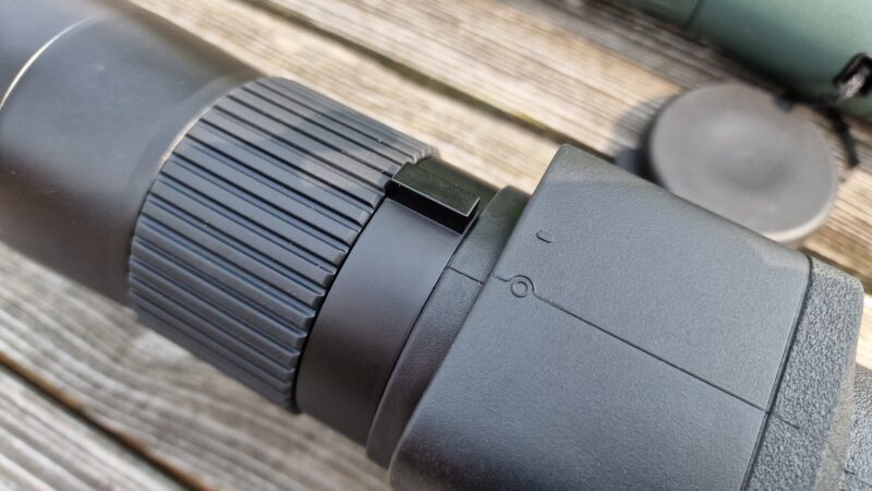 Het objectief deel is met zijn 60 mm lekker smal en voorzien van een brede focusring die bekleed is met geribbeld rubber. Het focussen gaat soepel en vlot. Je moet wel redelijk draaien om van close-focus tot oneindig te komen. Dit is enerzijds prettig om precies scherp te stellen, maar deze telescoop wil je juist uit de hand gebruiken, dan is veel draaien lastiger dan als de telescoop op een statief staat.
