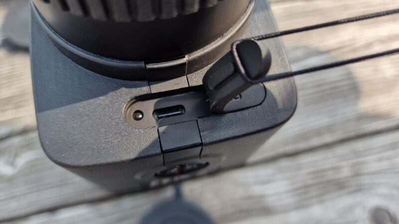 Het oculair sluit aan op een vierkant deel van de body. Hier is ook de statief-aansluiting (1/4 inch schroefdraad) in opgenomen. Dit is het deel waar de stabilisatie van het lenzen/prismasysteem plaatsvind. De stabilisatie wordt elektronisch aangestuurd en vraagt dus om voeding. Gekozen is voor een geïntegreerde batterij die op te laden is via een USB C aansluiting. Dit is de Europese standaard. Dit kan dus heel eenvoudig. Nu heeft Kite al geruime tijd ervaring met gestabiliseerde verrekijkers, en de geïntegreerde accu’s werken goed en lang. Hierover geen twijfel. Met een powerbank of rechtstreeks met een adapter (niet meegeleverd) aan de 220v en je kan er weer ruim 30 uur mee doen. Dus je staat niet snel zonder spanning. Overigens als een gestabiliseerde verrekijker (en dus ook deze telescoop) geen spanning meer heeft vanwege een lege accu, dan heb je nog steeds een telescoop die beeld geeft. Het beeld is gewoon 100% optisch, ook met stabilisator aan.