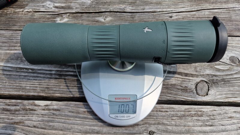 Het gewicht is een stuk zwaarder. met 1375 gram is dat bijna 370 gram zwaarder dan de kleine telescoop van Swarovski. Naar verwachting zit het merendeel in het blok waar de stabilisatie plaatsvind. Want qua glas zit er niet veel meer in. De diameter van de objectieflenzen meet net geen 60mm (ondanks zijn naam 60ED). ED doet vermoeden dat er glas en coatingen zijn gebruikt om kleurschifting (zogenaamde chromatische aberratie) zoveel mogelijk te voorkomen.