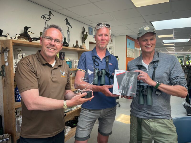 De fantastische prijs voor de “soort van het weekend” werd gewonnen door Jeroen de Bruijn en Han Zevenhuizen met hun ontdekking van een Amourroodstuitzwaluw op vrijdag 9 mei. Deze vogelsoort vloog over de Eierlandsche duinen en betrof een nieuwe vogelsoort voor Nederland (en dus Texel). Jeroen en Han wonnen een Nocpix Warmtebeeldkijker.