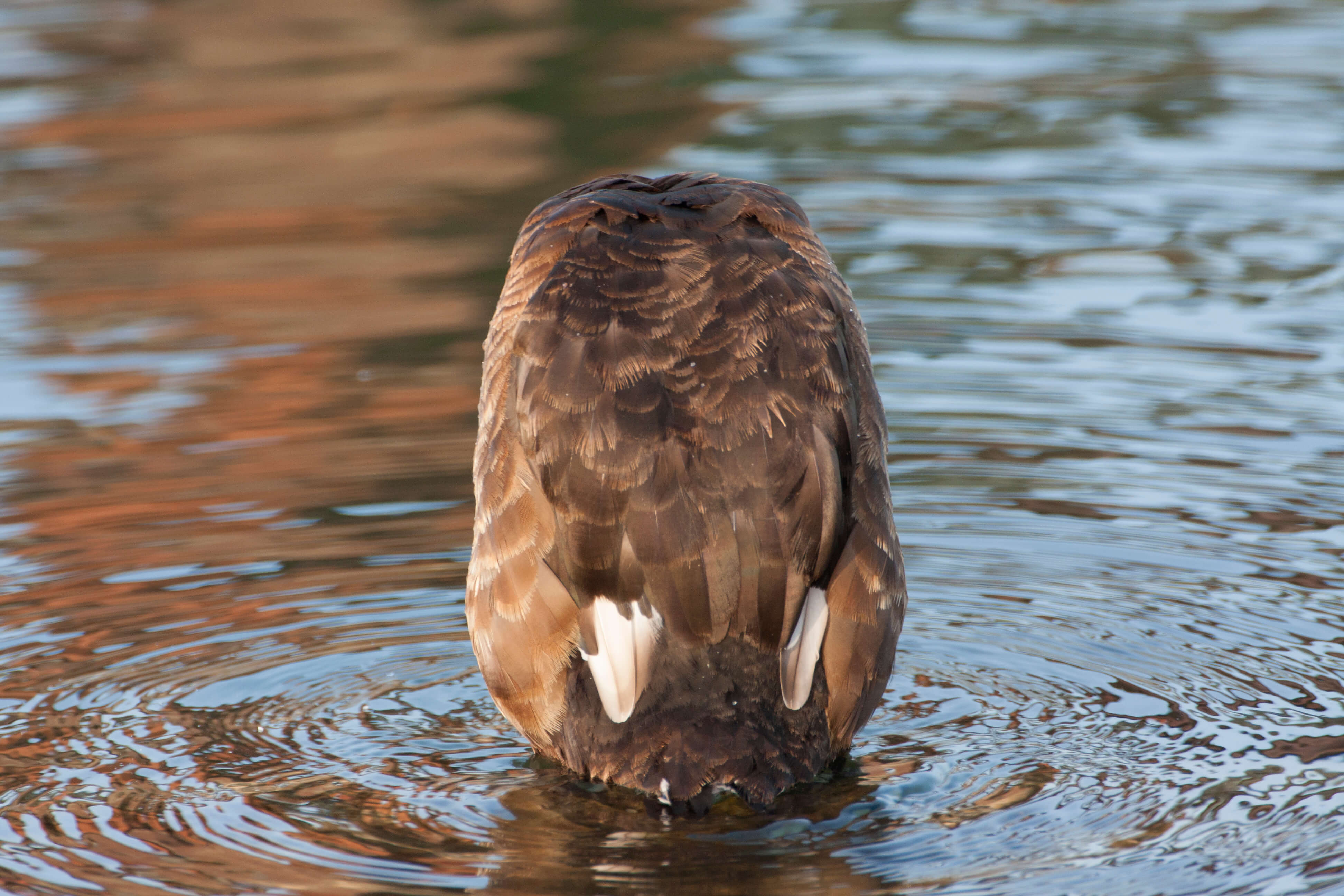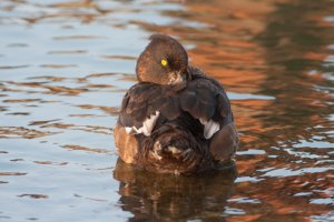 Een gevalletje je ziet ‘em wel of je ziet ‘em niet. Hier is een bruine eend te zien, de twee witte vlekken op de vleugel springen als eerste in het oog. Als we verder kijken zien we een donkerbruine rug die contrasteert met de lichter bruine flanken. Dit laatste kenmerk in combinatie met het vrij egale verenkleed duiden op een Aythya. In dit geslacht is maar 1 soort te vinden met zo’n combinatie van donkere rug en lichter bruine flanken: Kuifeend. De witte vlekken op de vleugel zijn misleidend, normaal zie je dit niet bij een Kuifeend. Waarschijnlijk zijn dit leucistische (o.i.d.) veren, aangezien de armpennen altijd een duidelijke donkere top hebben.