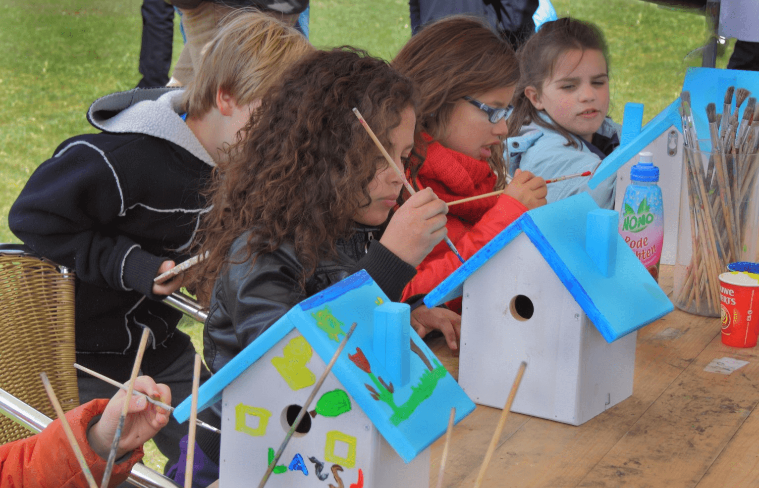 | Nestkast schilderen voor kinderen. Op 11 mei kunnen kinderen op het Waterplein terecht om een eigen nestkast te schilderen om. Kies een leuke nestkast voor de roodborst of voor de huismus en geef je nestkast een eigen kleur of eigen ontwerp. Het schilderen van nestkasten kost 10 euro en de opbrengst gaat naar het goede doel. De nestkast mag je uiteraard meenemen om thuis op te hangen. Meer informatie over het schilderen van nestkasten. |