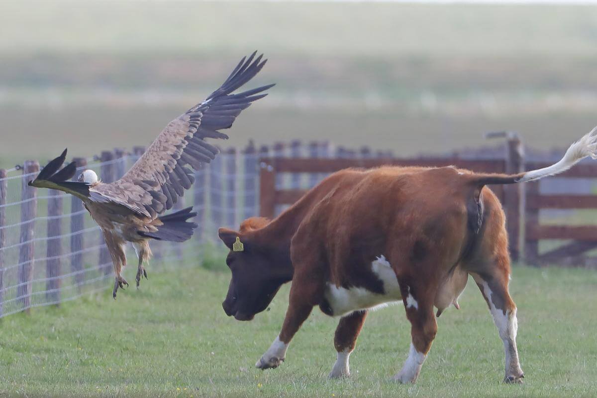 De Brandrode Koeien jagen de Vale Gier meerdere malen weg (Foto Eric Menkveld).