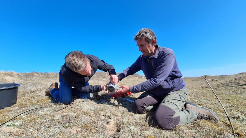 Frank Majoor (L) en Lennart Suselbeek (R) monteren een camera vlakbij een potentieel nesthol van de tapuit (foto: Thomas van der Es).