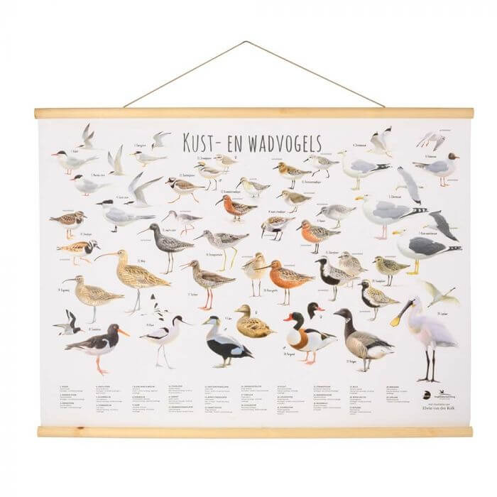 Leer meer over kust- en waddenvogels met deze prachtige wandposter. Alle veel voorkomende kust- en waddenvogels zijn natuurgetrouw nagetekend door Elwin van der Kolk. Van elke soort staat zowel de Nederlandse als Latijnse benaming vermeld. Tevens kunt u zien of het een jaargast of trekvogel is en indien afwijkend een man of vrouw is.