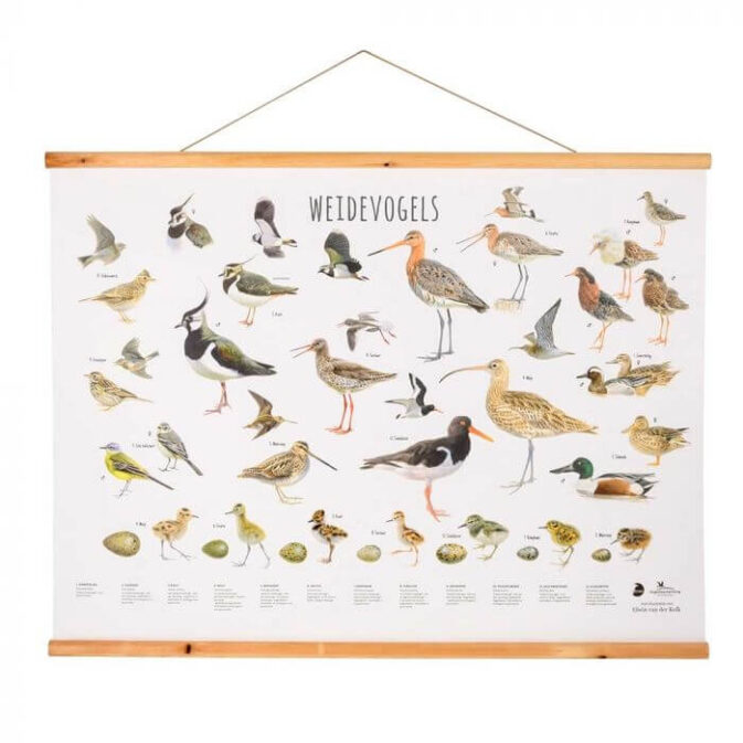 Leer meer over weidevogels met deze prachtige wandposter. Alle veel voorkomende weidevogels zijn natuurgetrouw nagetekend door Elwin van der Kolk. Van elke soort staat zowel de Nederlandse als Latijnse benaming vermeld. Tevens kunt u zien of het een jaargast of trekvogel is en indien afwijkend een man of vrouw is. Bovendien staan de jonge vogels en de eieren ook op de poster vermeld.
