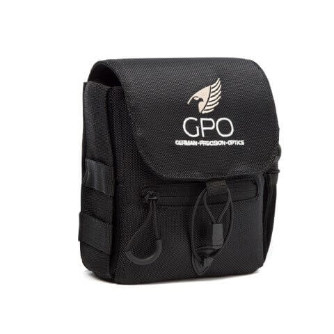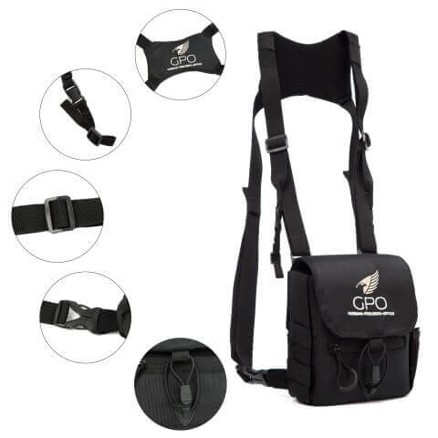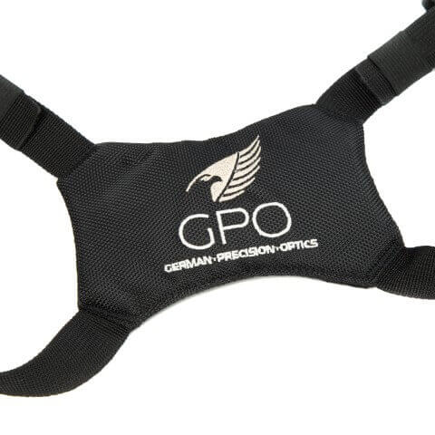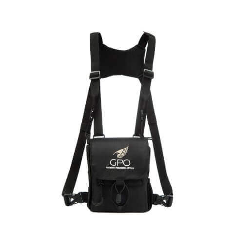 GPO is recent met een nieuw harnas op de markt gekomen: een systeem met een extra draagtas voor op de borst, waarin je kijkers tot een grootte van 42 mm objectief kunt meedragen.